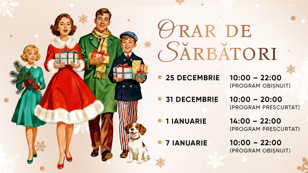 - 25 decembrie: 10:00 – 22:00 (program obișnuit)