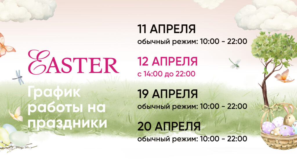 - 11 апреля: обычный график, 10:00 – 22:00