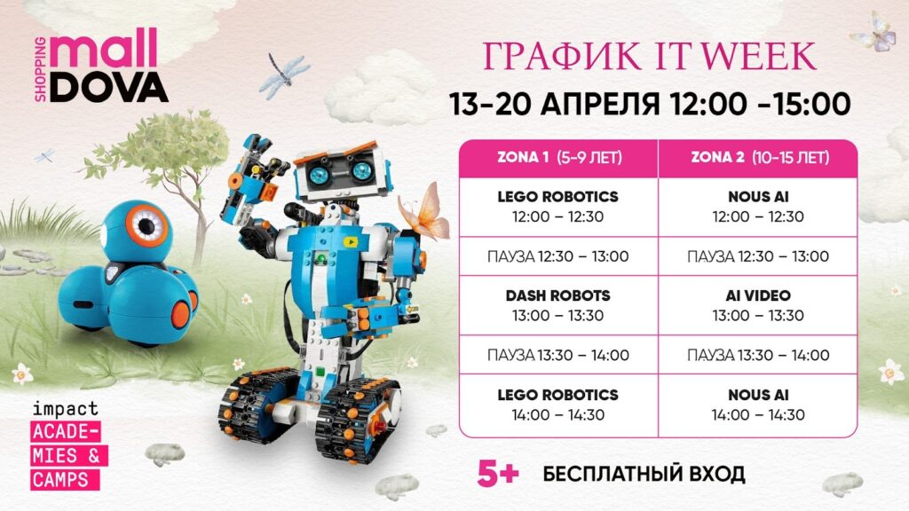 С 13 по 20 апреля с 12:00 до 15:00 Shopping MallDova проводит IT Week – серию бесплатных мероприятий для детей и подростков. Участники смогут познакомиться с миром технологий через интерактивные мастер-классы и увлекательные образовательные сессии.